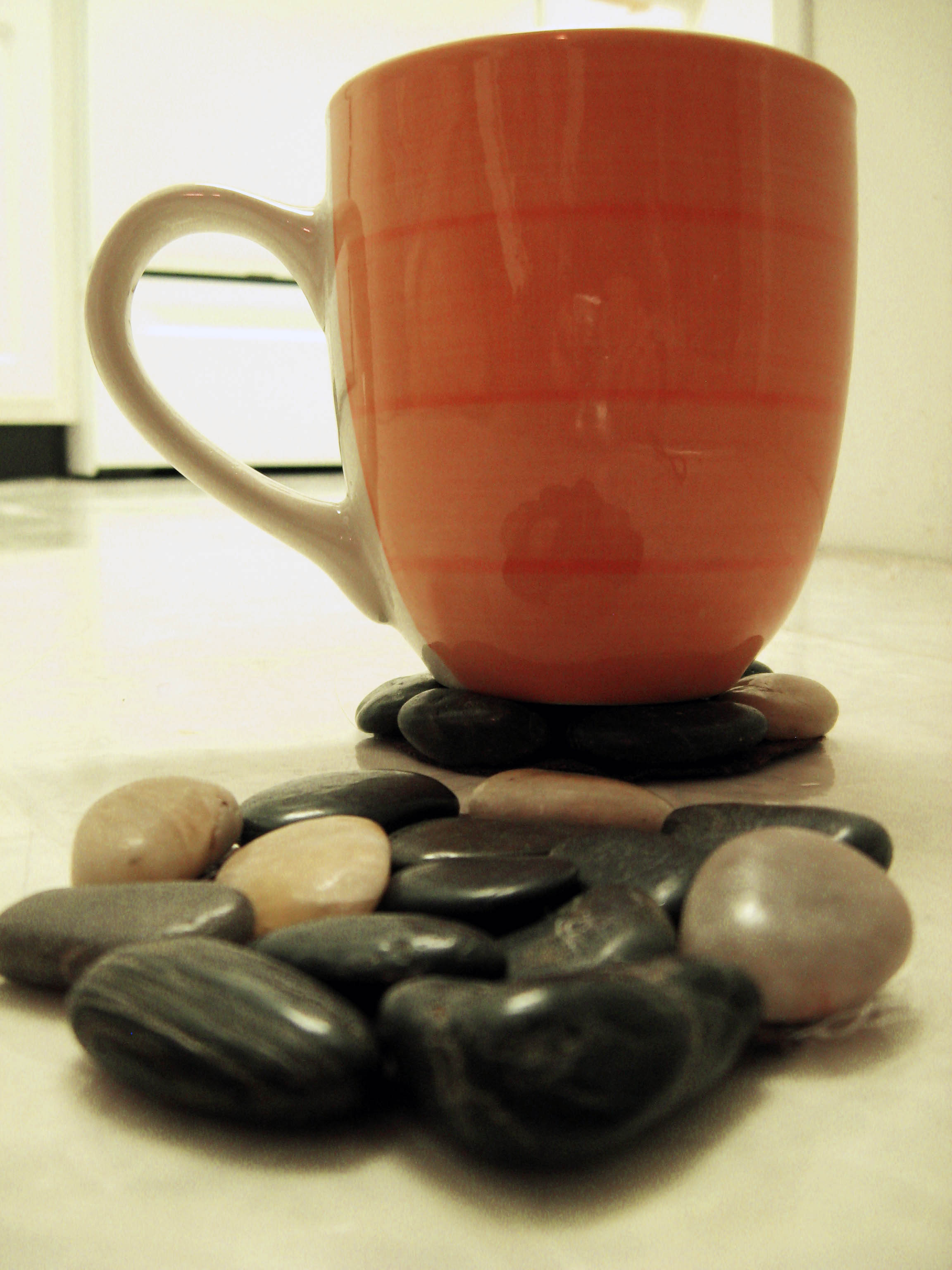 Arrange your pebbles on the felt until you are comfortable with the layout. Try to use flat rocks for the best results. This may also be a good time to test whether or not a cup will balance on the rocks you’ve chosen.
