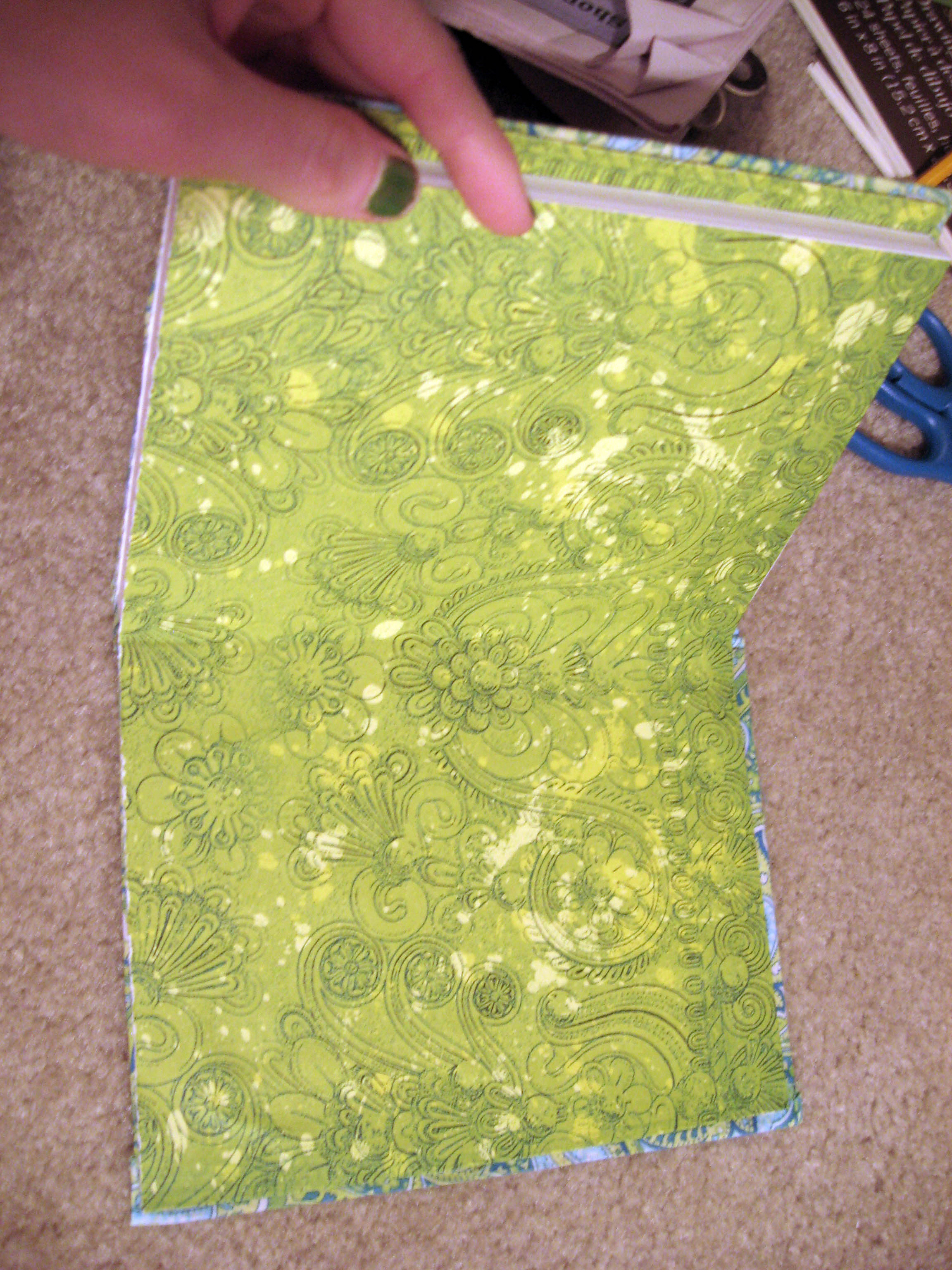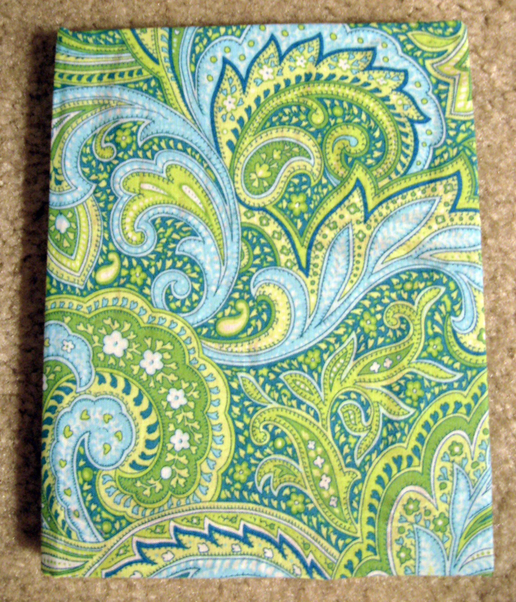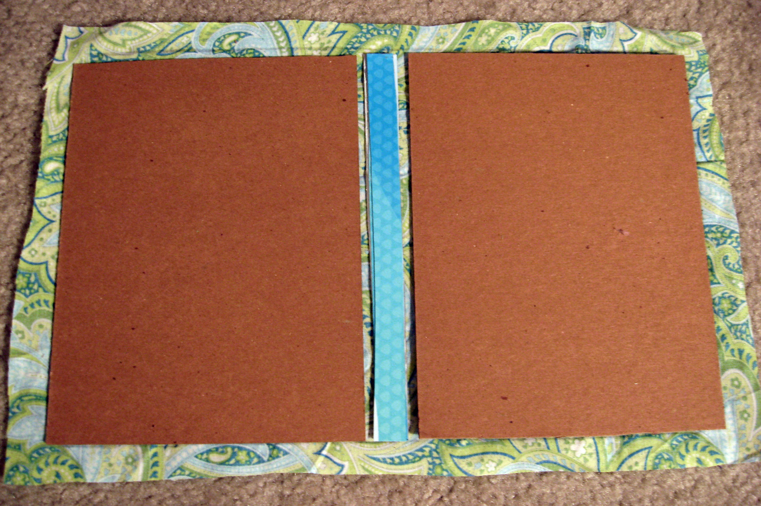 Lay out your fabric, or scrapbook paper. I did iron my fabric after I took this picture. Cut the fabric to be about an inch and a half larger than your paper is when opened up.