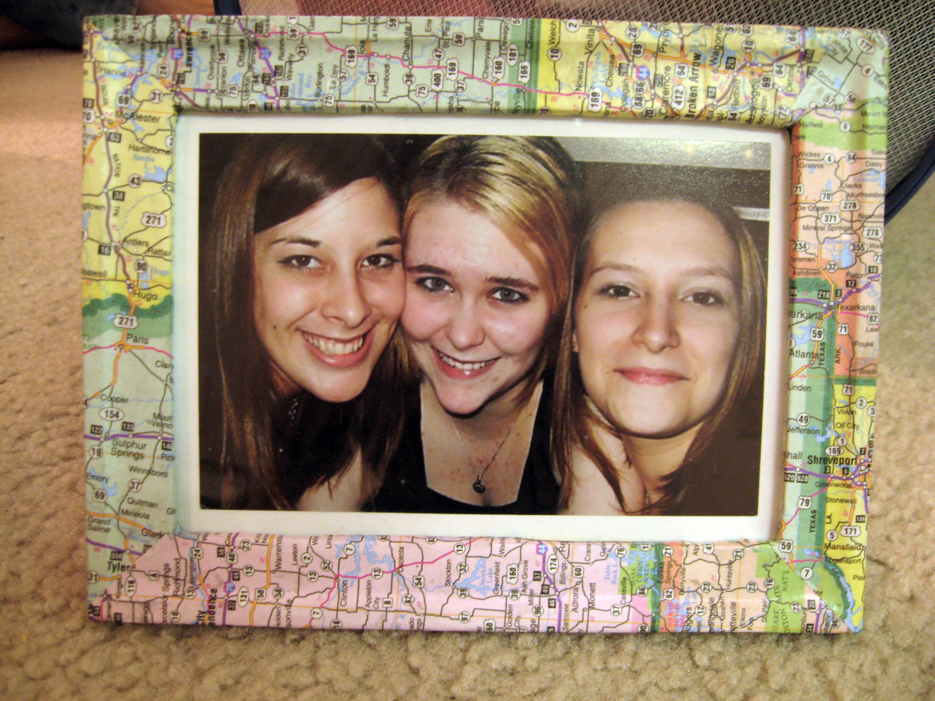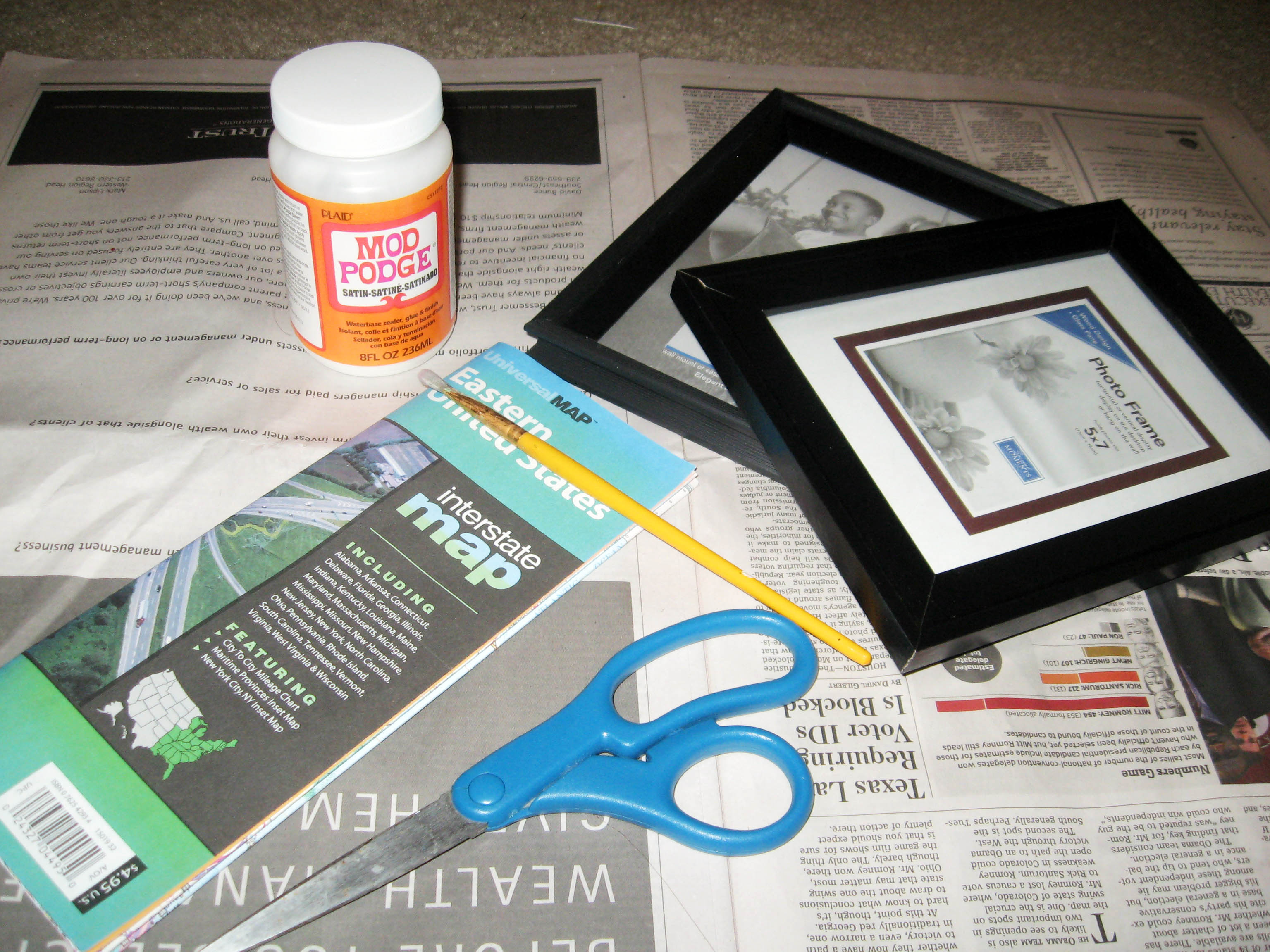 I saw these really cool frames on Etsy a few weeks ago. They had been decorated with scrapbook paper and were really pretty. Â I considered doing the same with some of my own but, I chose to use a map instead. Â You would be surprised how hard it is to find a map anymore. I went to three or four different stores before I found one that even carried maps. I guess GPS is really taking over the world…
