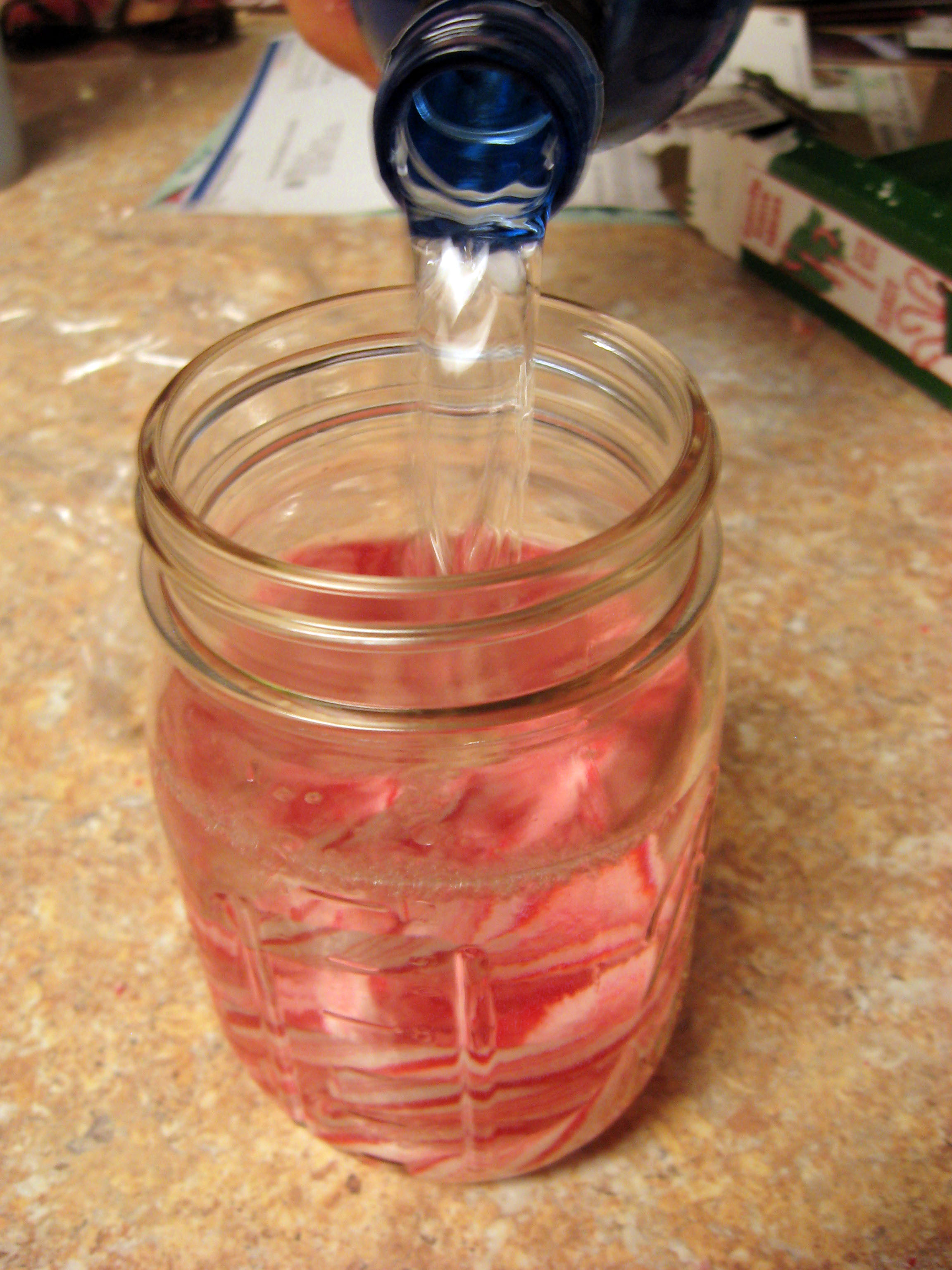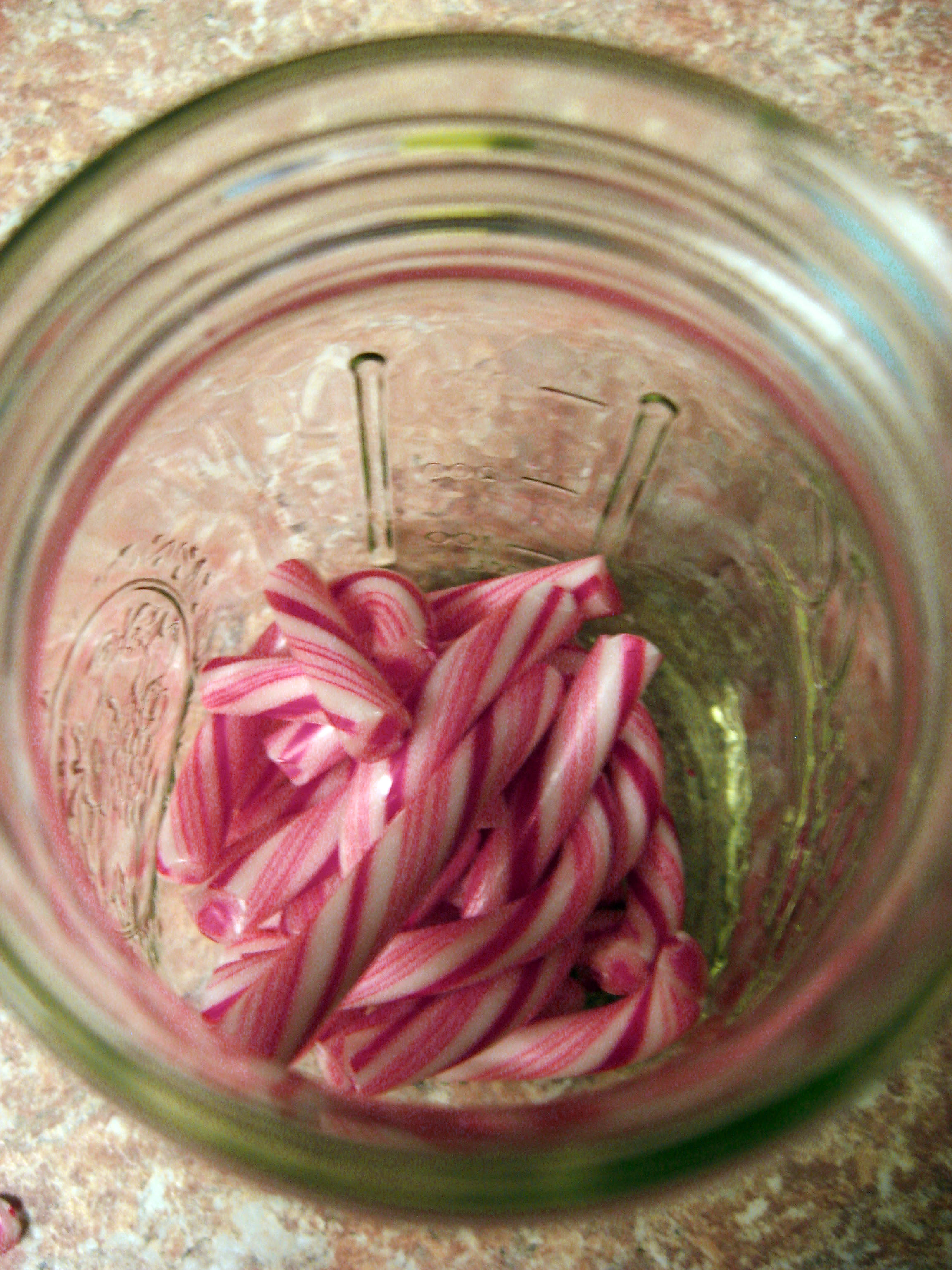 Break up a few candy canes (I think I used 7) and drop them into the bottom of your mason jar. The more candy canes you use the more flavorful your vodka will be.