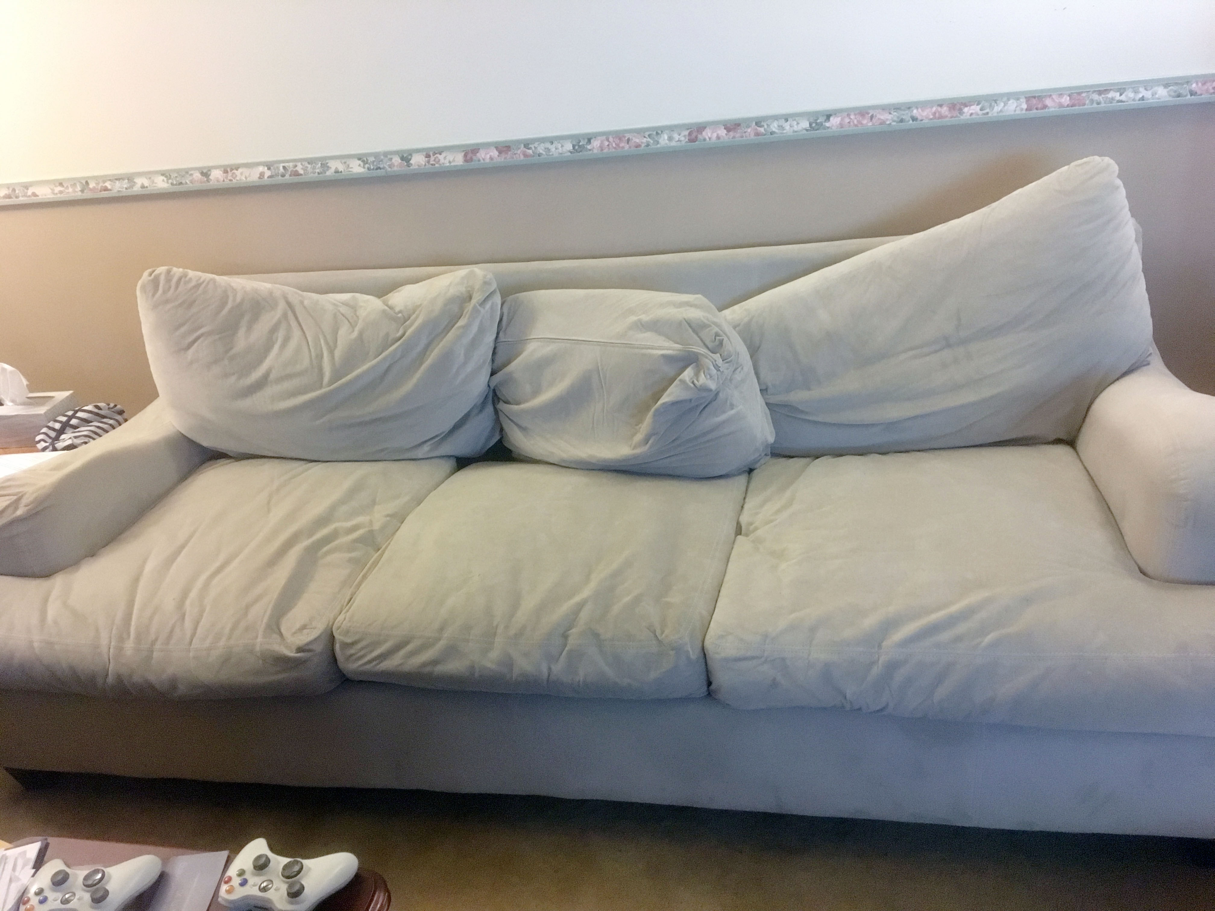 Starting with the cushions against the back of the couch, pull off the cover and begin filling it with Poly-fil. Stuff it until it’s full, but don’t overdo it. You still have to get the cover back on.