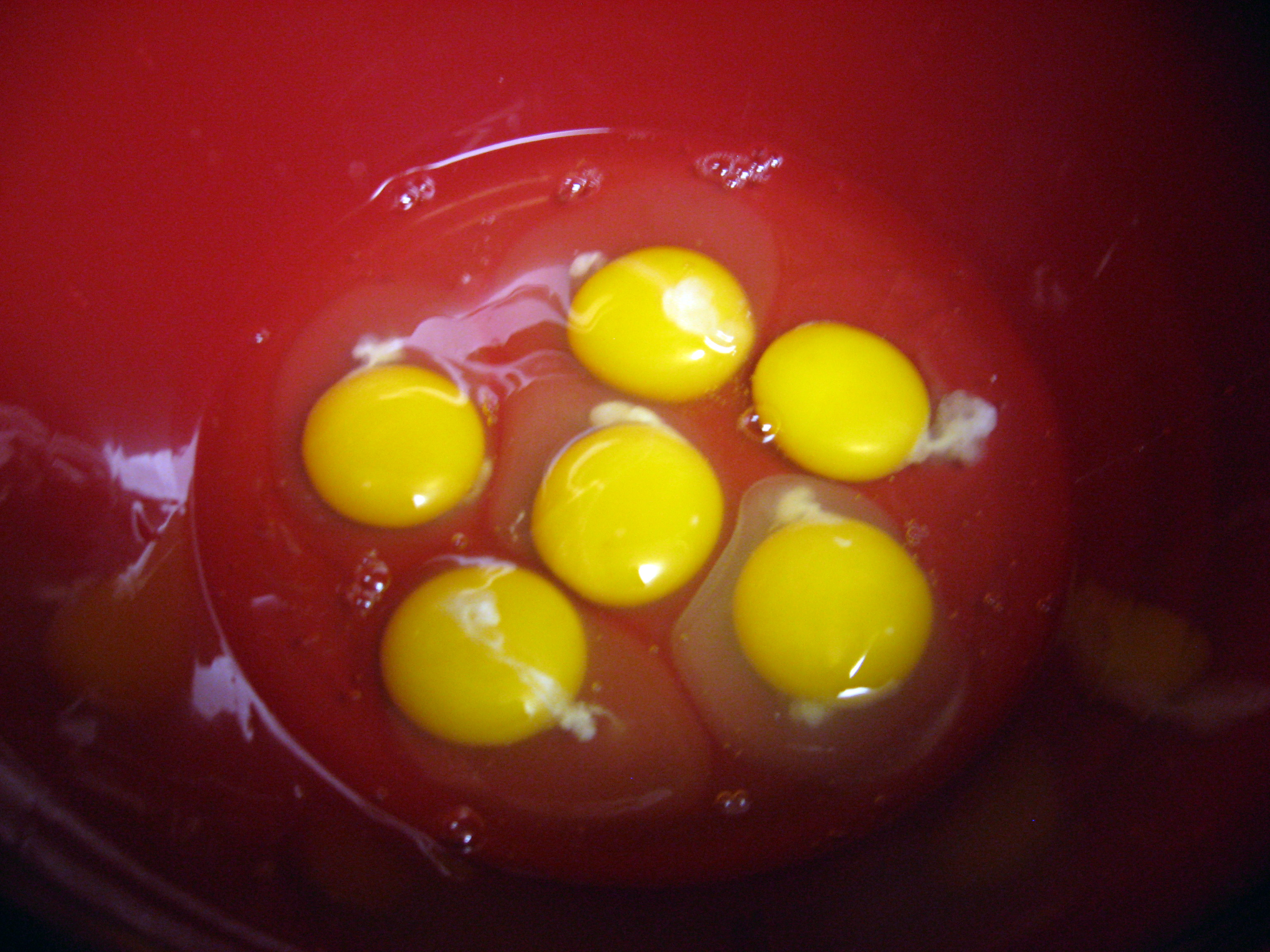 Crack 6 eggs into a bowl.