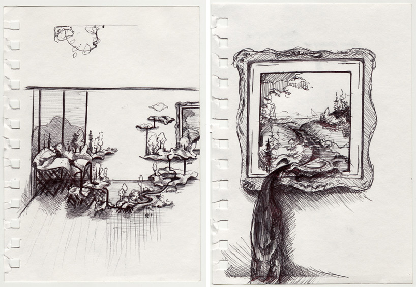 to lie without escape’. The landscape is made from trash he picked up in the park. The landscape painting measures 6 ft by 5 ft and is set with a gilded frame that is interupted by paper as water flows from the canvas into the gallery space. The boulders in the landscape are cast from the rocks taken from central park, while the grass is formed from glue, paint and hair.
