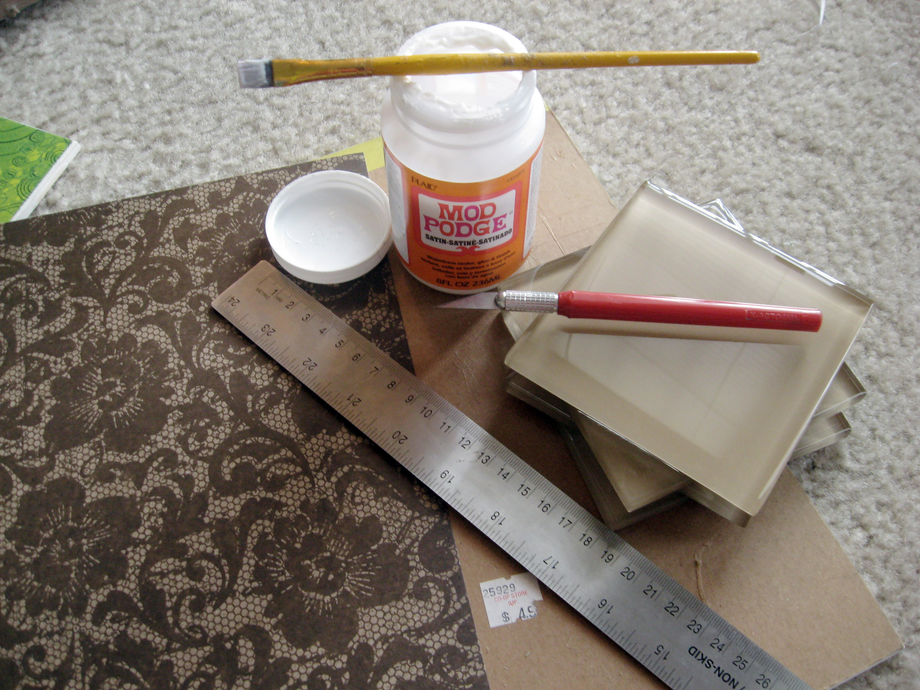 Measure your scrapbook paper to fit the top of your tile. I am making four coasters so I cut out four squares.
