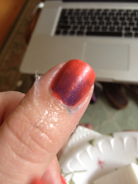 Subsequent nails were less successful. Apparently, to make this work properly, you have to re-paint your sponge each time. This, in case you couldn’t guess, is a huge pain in the ass. But I tried it both ways, and you definitely need to reload the sponge for proper results. Also, it would probably be better if you used a new sponge for each subsequent nail.