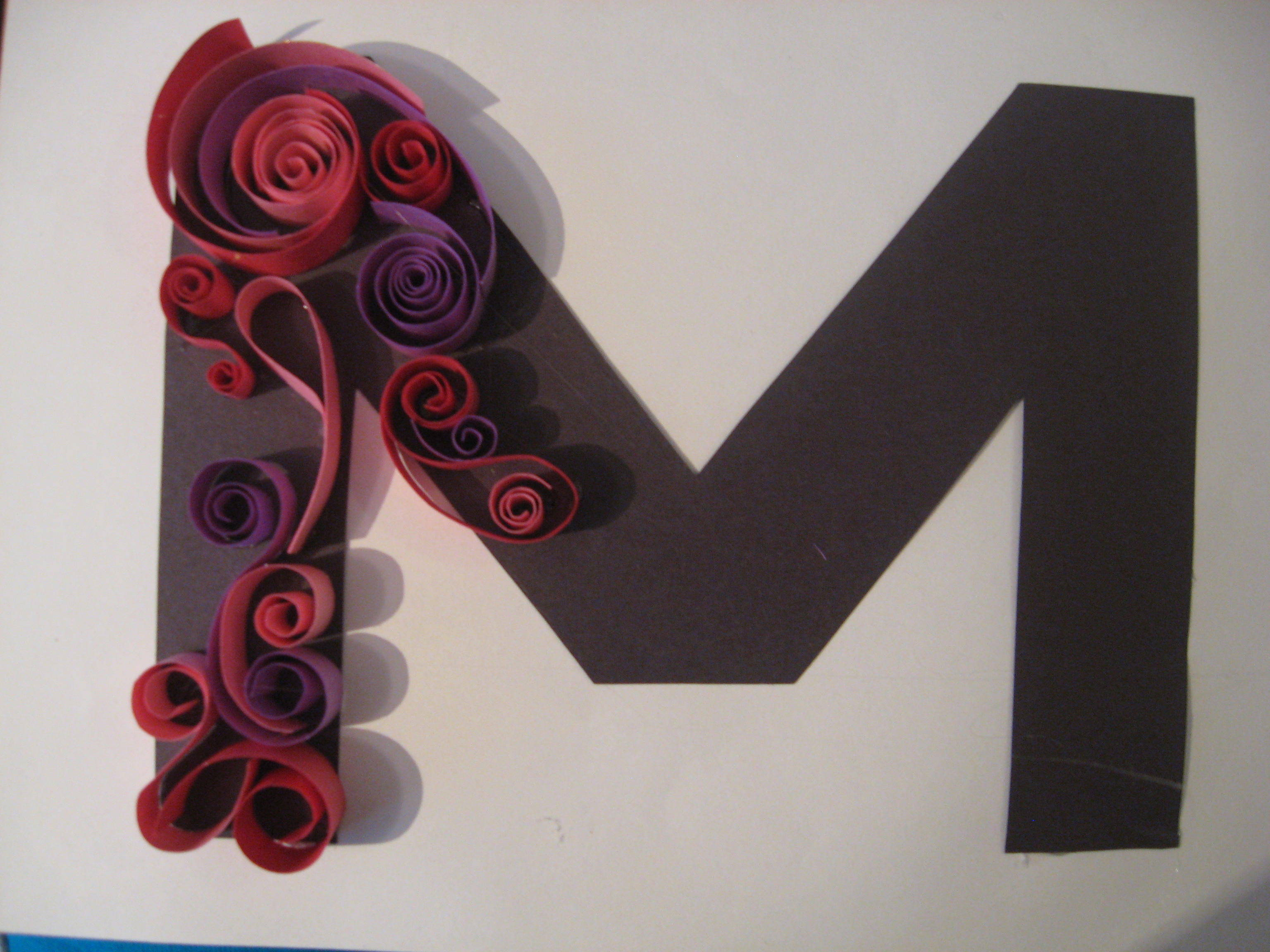 Use the black paper to cut out the letter of your choice. I chose M. When you are happy with your letter glue it to the center of your white paper.